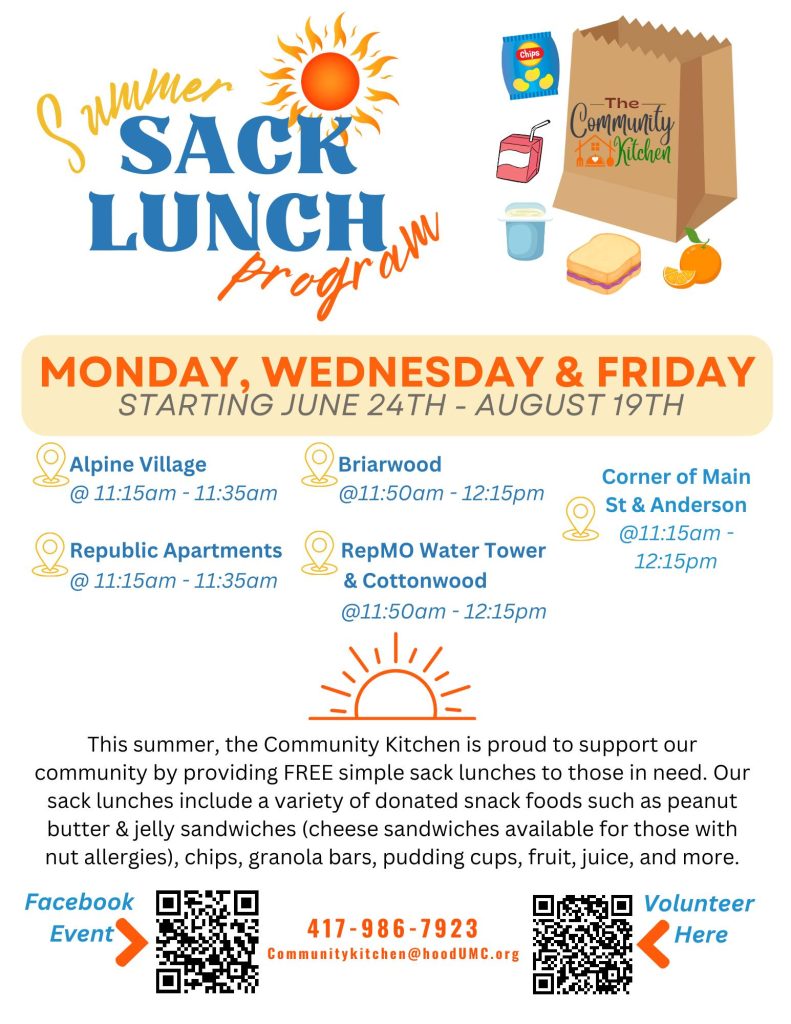 Mark your calendars and spread the word because here are the details you’ve been waiting for: The Free Summer Sack Lunch program will be rolling into Alpine Village, Briarwood, Republic Apartments, RepMO Water Tower & Cottonwood, and the Corner of Main Street & Anderson. With a schedule set for Monday, Wednesday, and Friday across these locations, we’re ensuring that convenience and accessibility are at the forefront of our mission. Each visit offers a window of time dedicated to serving you, making it easy to plan your day and swing by for a delightful lunch prepared just for you.